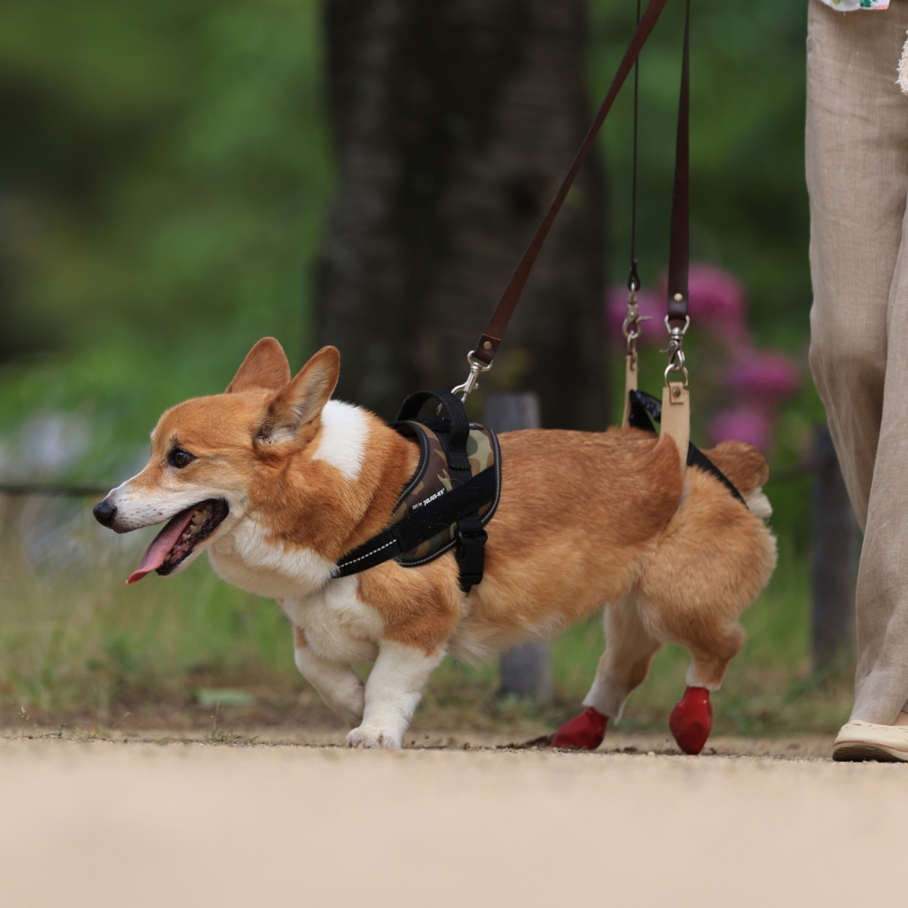 てくてくリフト…DMなどで後ろ足が不自由になったワンコの腰を引き上げて姿勢を保ち、前足の動きをサポートします。